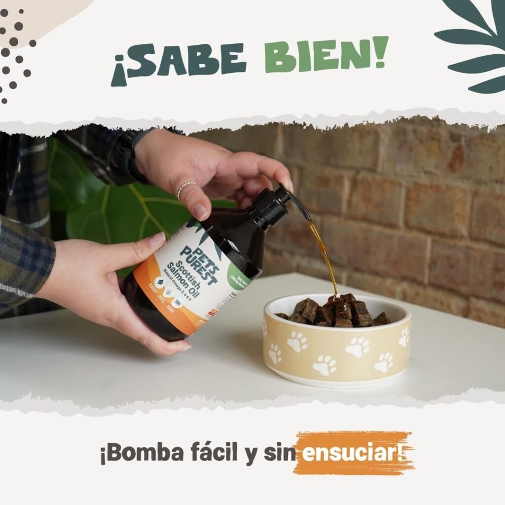 A muchos dueños les da miedo comprar aceite de pescado porque creen que toda la casa olerá mal. Pets Purest utiliza salmón escocés prensado en frío de grado humano. Huele a fresco, no a pescado pasado, y viene en un bote opaco que protege el aceite de la oxidación.